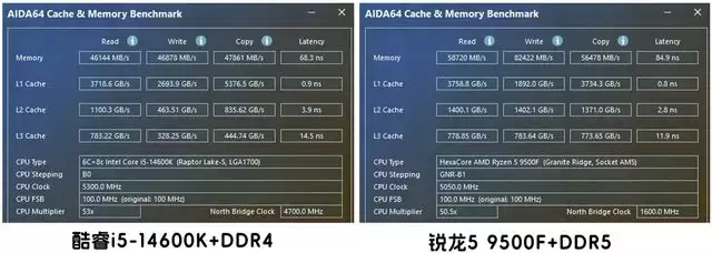 因为频率上的较大差别,可以看到锐龙5 9500F+DDR5在理论成绩上明显优于酷睿i5-14600K+DDR4平台。在《AIDA 64》的内存性能测试中,锐龙5 9500F+DDR5内存读取带宽、写入带宽、拷贝带宽方面分别领先对手27.25%、78.82%、18%,差距明显。