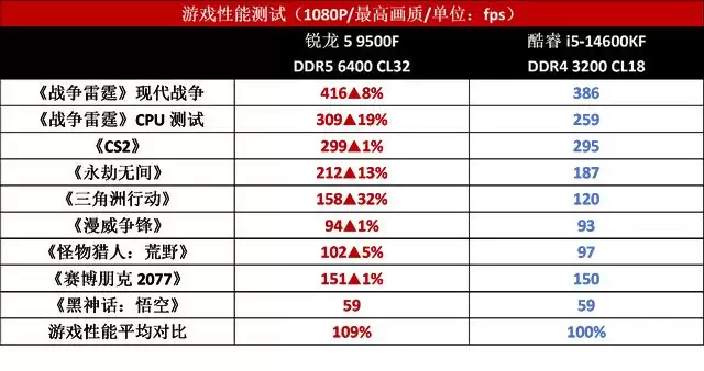在《三角洲行动》当中,锐龙5 9500F+DDR5的帧率达到了158fps,而酷睿i5-14600K+DDR4的帧率不过120fps,两者之间性能的差别最大,达到了32%。而在《战争雷霆》CPU测试和《永劫无间》两个项目中,锐龙5 9500F+DDR5也分别领先了19%和13%,差距同样明显。在《战争雷霆》现在战争项目中,锐龙5 9500F+DDR5也有8%的性能领先。