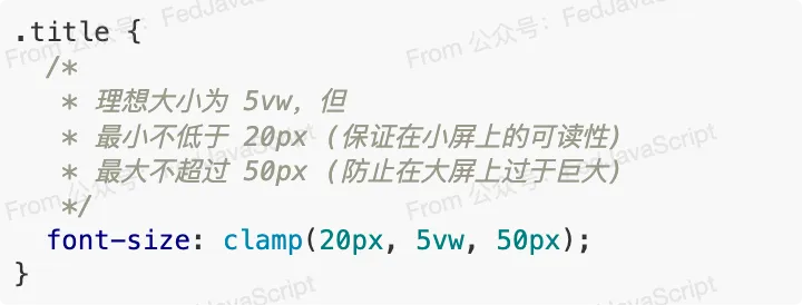 最小值:兜底值,安全下界。 理想值:动态目标值,通常是基于 vw 计算的。 最大值:安全上限值。让我们用 clamp() 来改写上面的标题例子: