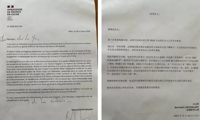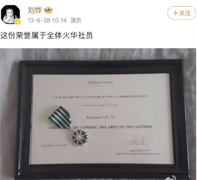 12月8日,刘烨在微博分享新剧杀青消息,同时晒出一个巨大惊喜——法国艺术与文学军团军官勋章。证书落款是法国驻华大使白玉堂,字里行间尽是表彰他“推动电影创作”“促进中法艺术交流”。