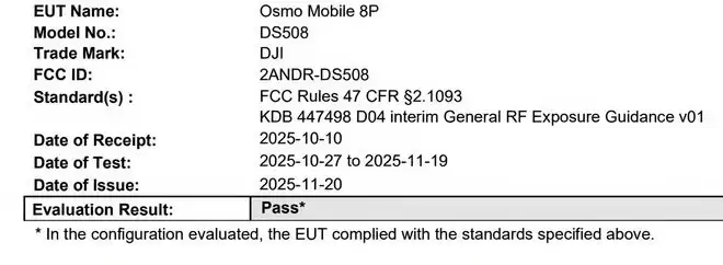 认证文件表明,大疆正在筹备一款型号为 DS508 的新设备。文件显示其 FCC ID 为 2ANDR-DS508,产品名称确认为 Osmo Mobile 8P。通过 FCC 认证,通常意味着产品硬件已定型,并接近量产阶段。