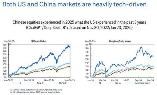 这家美国知名投行将2024年11月ChatGPT的问世与今年1月DeepSeek-R1的发布进行对比后得出结论,“中国股市在2025年所经历的,正是美国市场在过去3年所经历的。”
