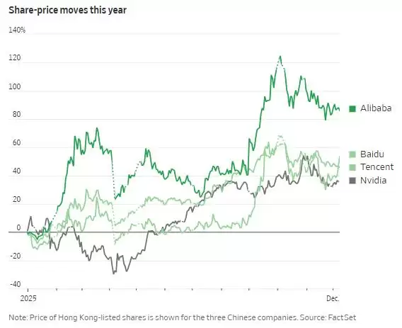 据数据提供商LSEG统计,美国先锋集团、贝莱德和富达管理的基金今年均增持了阿里巴巴在香港上市的股票。同样部署生成式人工智能核心技术——大型语言模型的中国科技企业腾讯和百度股价今年也上涨了近50%。