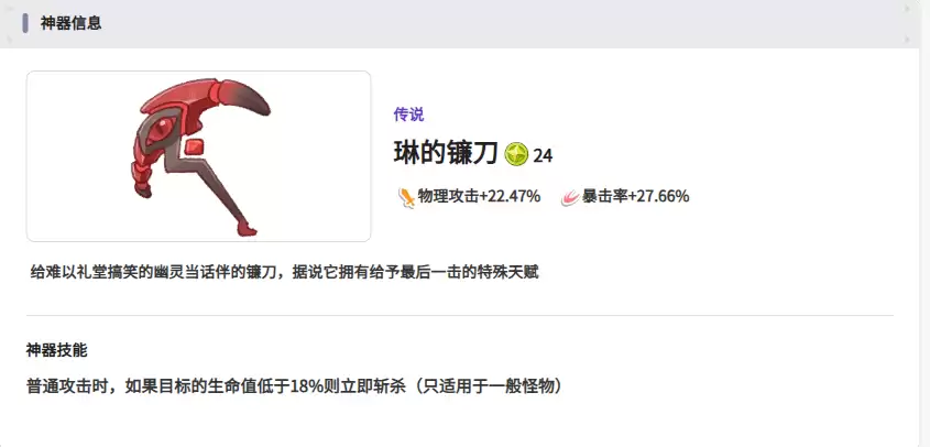 琳的镰刀适合给物理系的角色使用,可以提升物理攻击能力,并有一定的暴击加成。使用这把武器时,普通攻击伤害也有额外效果,有机会触发斩杀,对付残血敌人效果极佳。