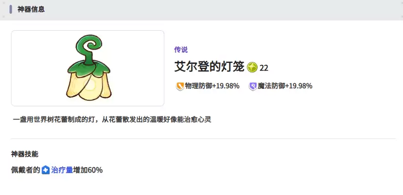 艾尔登的灯笼非常适合用在前排角色身上,它拥有不错的物理防御效果,魔法防御也有一定加成,还具备一定的治疗能力,可以让伙伴们回复一定的血量,显著提升队伍的持续作战能力。