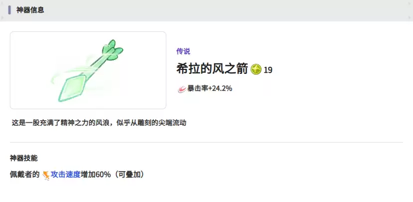 希拉的风之箭最适合配备给风属性的角色,效果会更上一层楼。装备提供的加成效果十分出色,拥有高达60%的攻速增加,叠加起来用于暴击流玩法非常合适。如果你偏爱使用风属性角色,不妨试试这把武器。