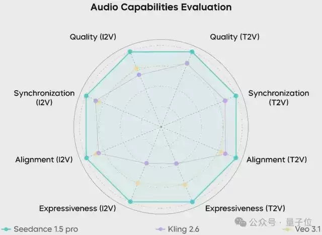 在针对视频与音频能力的综合评测中,Seedance 1.5 pro 在审美(Aesthetics)、运动质量(Motion)以及音画对齐(Alignment) 等核心指标上均处于行业领先地位。