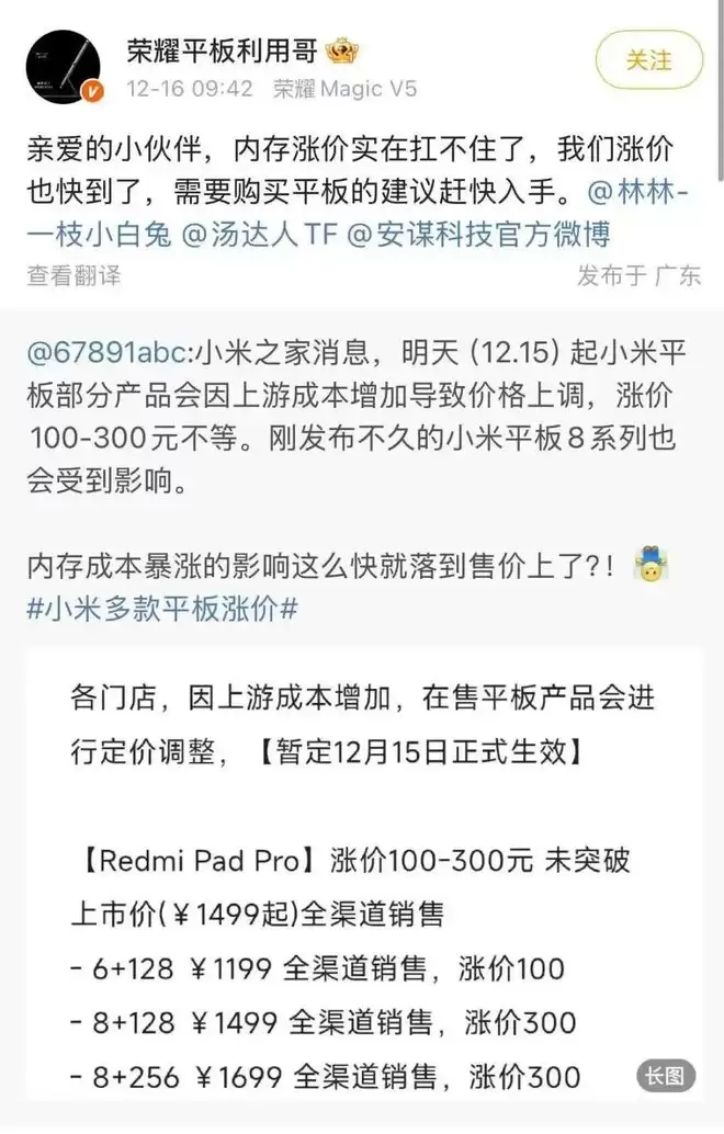 当下,部分小米在售平板电脑、荣耀平板电脑已官宣涨价消息,前者涨幅在100-300元不等。