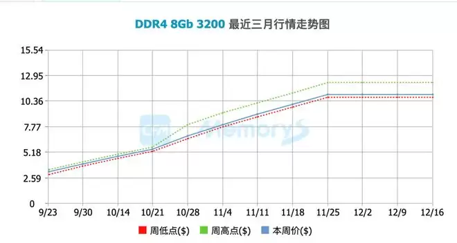 即便如此,实际的涨幅还是超越了大部分的预期。“就拿4代内存来说,8G-3200频率,海力士颗粒以及三星颗粒的,涨前价格平均在70每根,截止到目前12.17号平均价格在350每根,涨幅在280%左右。”小赖讲道。