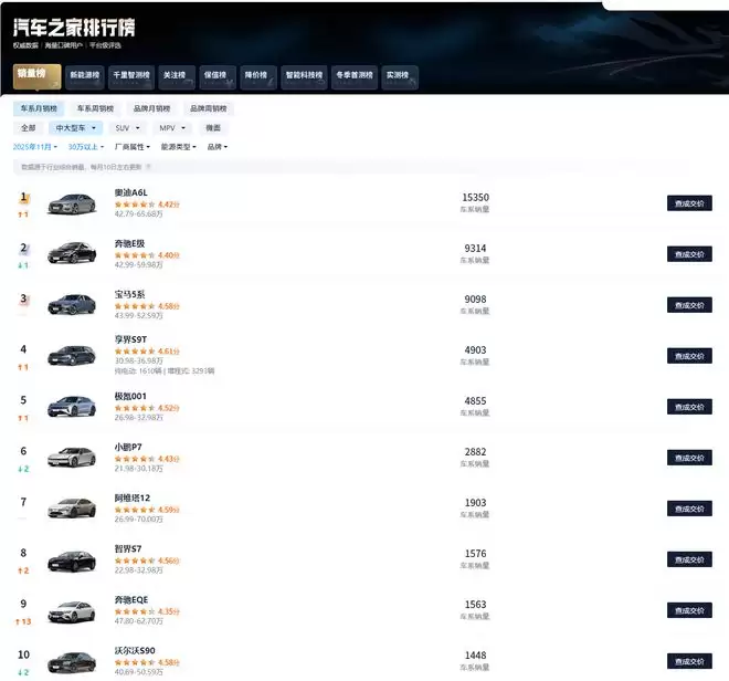 汽车之家2025年11月中大型轿车排行榜
