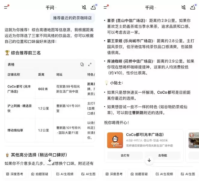 观察者网对此进行了实测,当要求“推荐最近的奶茶咖啡店”时,千问结合了高德地图等信息源,快速筛选出三家近距离的饮品店,同时贴心地给出了更多高分选项(距离稍远但口碑更好)。如果想导航前往其中某家,点击系统给出的门店卡片,即可直接跳转到高德地图进行导航。
