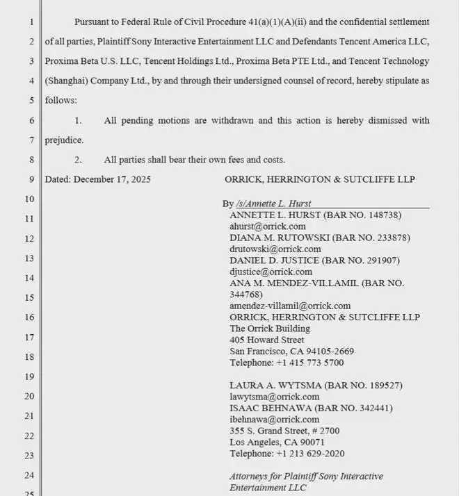 刚刚,据外媒The Verge援引最新提交的法院文件显示,索尼与腾讯已就相关争议达成一项保密和解,案件被有偏见驳回(dismissed with prejudice),这意味着双方将不再就同一争议重新提起诉讼,也不会就此事发表进一步的公开评论。