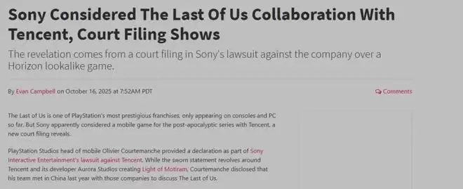同年7月,外媒报道索尼移动部门主管亲访腾讯,探讨《最后生还者》手游在内的诸多合作可能。
