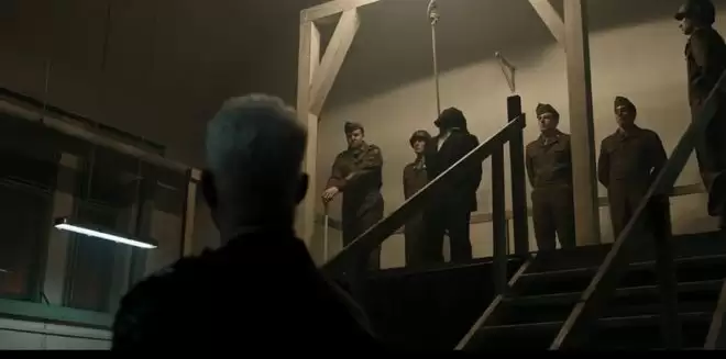 首次庭审后,凯利医生看到1200个集中营各种瘦骨嶙峋的犹太人,以及尸横遍野的恐怖情况。他愤怒地回到牢房,开始质问戈林。