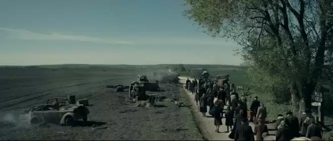 开篇在二战末期,此时希特勒已死,纳粹战犯即将接受审判。林边小道上人群熙熙攘攘走过,路边汽车则被毁坏,山雨欲来风满楼!