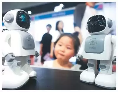 在浙江省义乌国际博览中心,AI音乐机器人的表演吸引了孩子的目光。