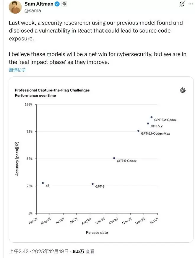 Altman在社交平台上披露:“上周,一名使用我们上一代(Codex)模型的安全研究人员发现并披露了React中可能导致源代码暴露的漏洞。我相信这些模型对网络安全将产生净收益,但随着它们的改进,我们正处于'真实影响阶段'。”