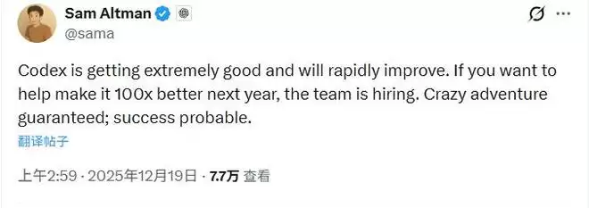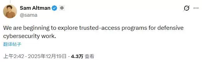 Altman在X上表示:"我们正在开始探索用于防御性网络安全工作的可信访问计划。"他还在另一条帖子中为Codex招聘打广告:"Codex变得极其出色,并将快速改进。如果你想帮助它在明年变得好100倍,团队正在招人。保证有疯狂的冒险,成功的可能性很大。"