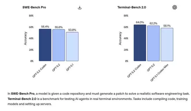 OpenAI介绍,GPT-5.2-Codex在编码性能、网络安全能力和长周期任务处理上均实现突破。GPT-5.2-Codex在SWE-Bench Pro测试中准确率达到56.4%,在Terminal-Bench 2.0测试中达到64.0%,刷新两项基准测试纪录。该模型已于发布当天在所有Codex界面向付费ChatGPT用户开放,API用户接入正在推进中。
