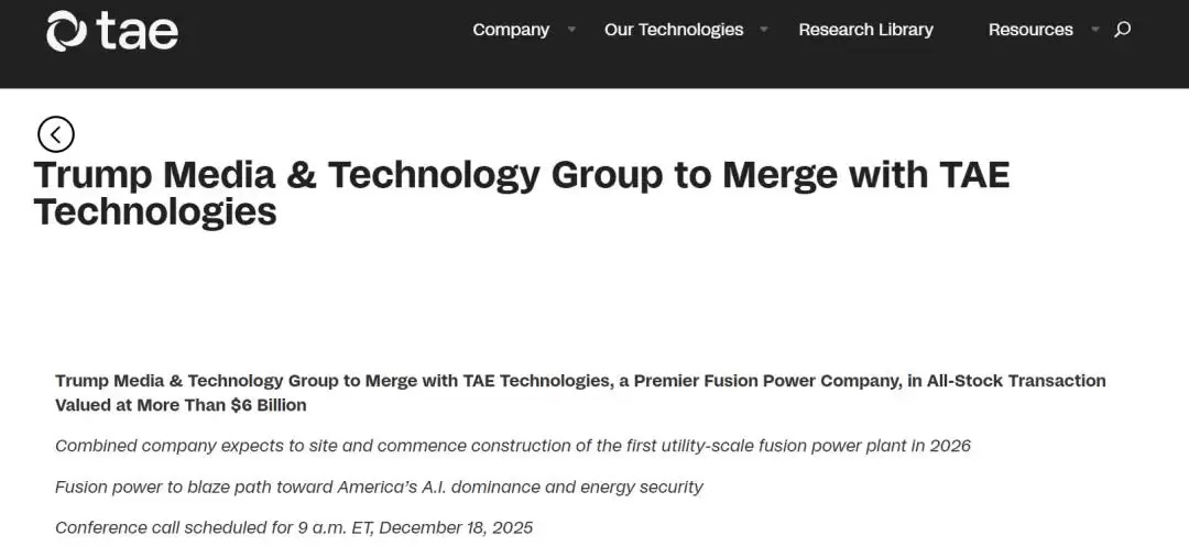 特朗普媒体与科技集团(DJT)已同意与Alphabet支持下的核聚变能源企业TAE Technologies进行全面换股合并,交易总额预计突破60亿美元。