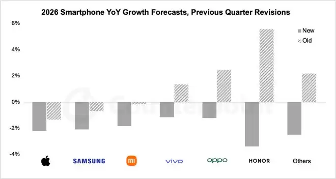 报告指出,存储芯片价格上涨是背后的核心驱动力。动态随机存取存储器(DRAM)的价格攀升,整体推高了手机的物料成本(BoM)。预计到2026年第二季度,物料成本的增幅将介于8%至超过15%之间。其中,荣耀、OPPO和vivo等中国手机品牌厂商对市场预测的修正幅度,显得尤为显著。