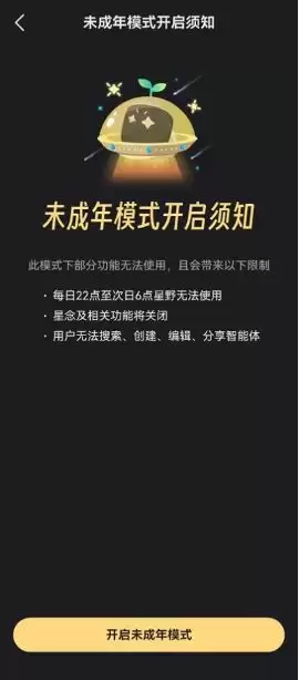 作为一款专注AI陪伴的智能体应用,星野在App端特设了未成年人模式。开启该模式,用户每日22点至次日6点将无法使用星野App,星念及相关功能将关闭,且无法搜索、创建、编辑、分享智能体。