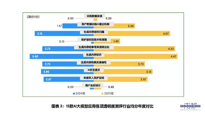 南都数字经济治理研究中心去年底发布的《生成式AI风险感知和信息披露透明度测评报告(2024)》指出,15款AI大模型应用的信息透明度的平均得分为60.2分。各家在训练数据来源、用户数据训练撤回机制、版权归属及其保护措施、生成内容的准确性说明、用户友好设计等方面,仍存在信息披露不足的问题。