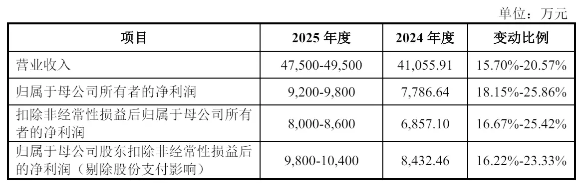 展望2025年全年,优迅股份预计营业收入将在4.75亿元至4.95亿元之间,较上年同期的4.1亿元增长15.70%至20.57%;预计净利润为9200万元至9800万元,较上年同期的7786.6万元增长18.15%至25.86%;预计扣非后净利润为8000万元至8600万元,较上年同期的6857万元增长16.67%至25.42%。