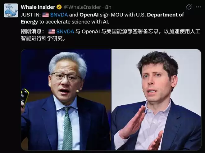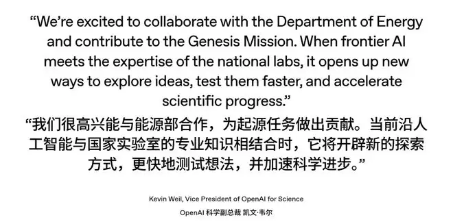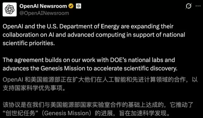 OpenAI也发表了备忘录,表示已经与美国能源部签署文件,加速AI驱动科学的发展。