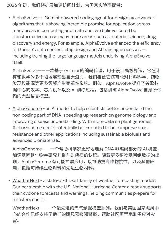 在2026年,谷歌还将为国家实验室提供AlphaEvolve、AlphaGenome和WeatherNext。