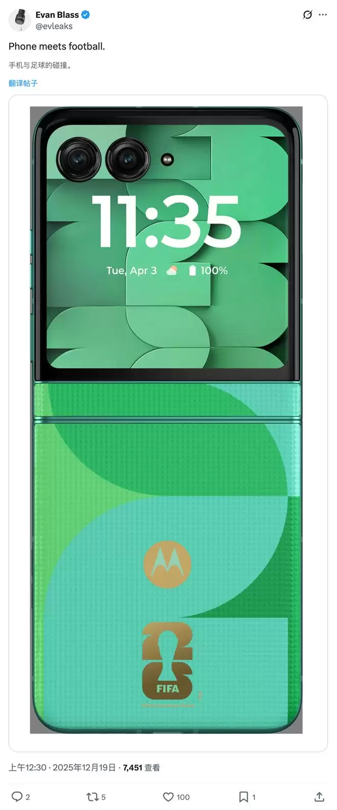 IT之家 12 月 19 日讯,随着 2026 年 FIFA 世界杯进入倒计时,摩托罗拉的一款世界杯定制机型提前亮相。据爆料博主 Evan Blass 放出的最新消息,摩托罗拉将推出 Razr 2025 FIFA 世界杯特别版。