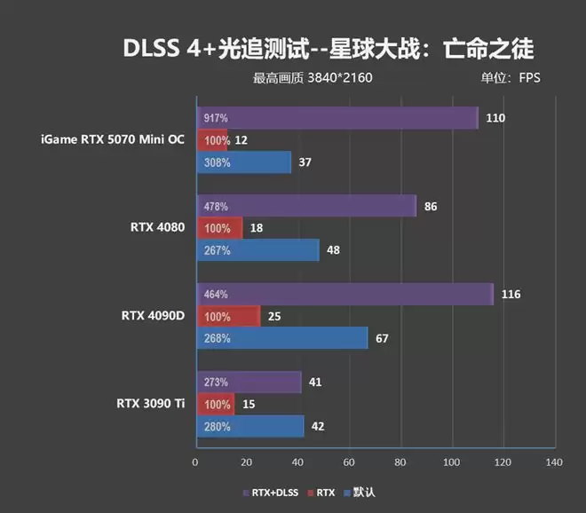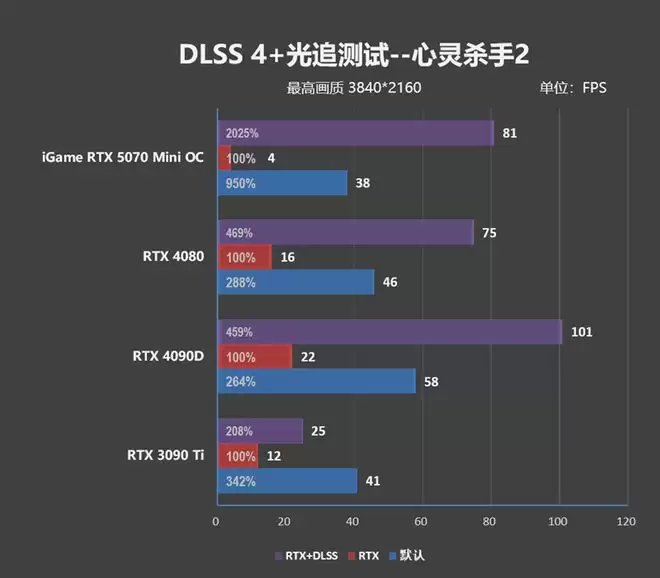 RTX 50系显卡的杀手锏无疑就是DLSS 4技术。令人难以想象的是,在开启DLSS 4之后,iGame RTX 5070 Mini OC 12GB在部分游戏中的性能提升幅度超过了1000%,整体表现可以媲美RTX 4090D。