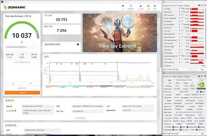 在4K分辨率3DMark Time Spy Extreme测试中, iGame RTX 5070 Mini OC图形分数为10751,核心温度最高76℃,核心运行最高频率为2947MHz,最高功耗252W。