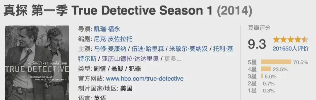 如果你一生只看一部悬疑犯罪美剧,那《真探》第一季绝对可以列入你的首选名单。豆瓣评分9.3,IMDb上超过60万人打出了8.9分的高分。