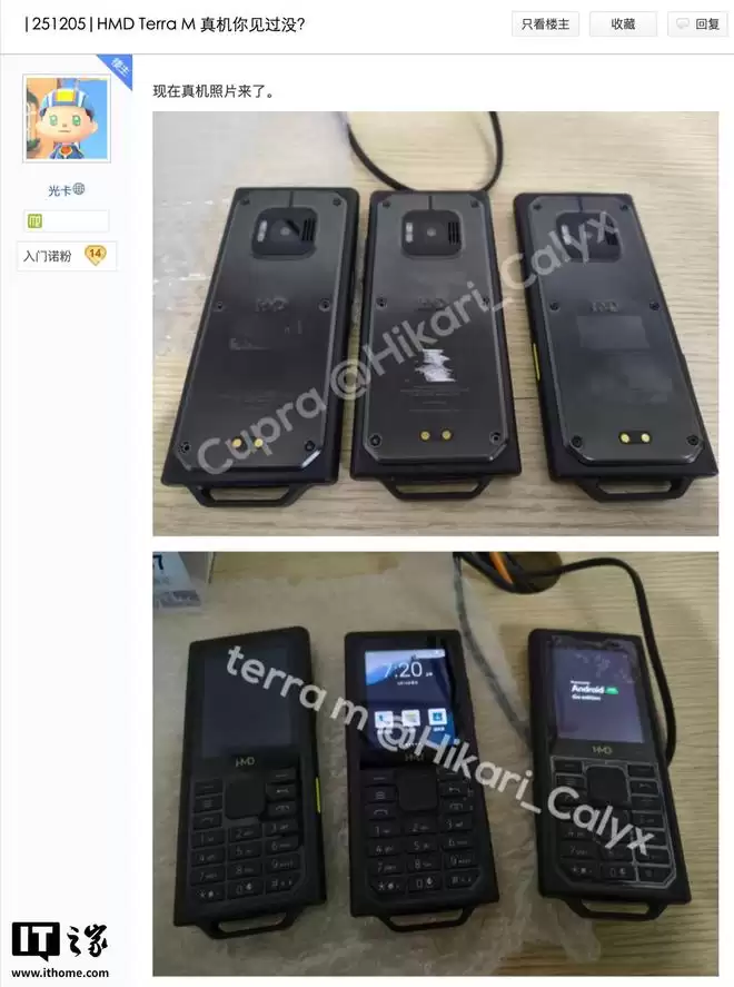 来自 IT 之家的最新消息,HMD Global 在今年 11 月亮相的 Terra M 三防手机,预计将于明年第一季度正式上市。目前,消息源 Hikari_Calyx(光卡)已在诺记吧公布了这款手机的真机谍照,显示其机身设计紧凑,搭载 Android 操作系统。