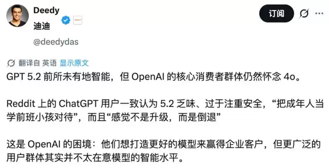 在 X 和 Reddit 上,愤怒与失望几乎写在每一条评论里。人们又一次怀念起那个曾经的「白月光」GPT-4o:有人说 GPT-5.2 变得平淡、乏味、像被磨平了棱角;也有人讥讽它成了「把成年人当幼儿园小孩对待」的说教。