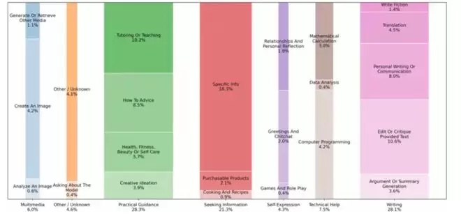 普通用户很少需要一台「竞赛级大脑」,他们更多需要一个「日常好用的助手」。OpenAI 对 150 万次对话的大规模分析佐证了这一判断,用户的核心需求极其接地气:实用指导(29%)、信息查询(24%)以及写作(24%)等,而与编程任务相关的对话只有 4.2%。