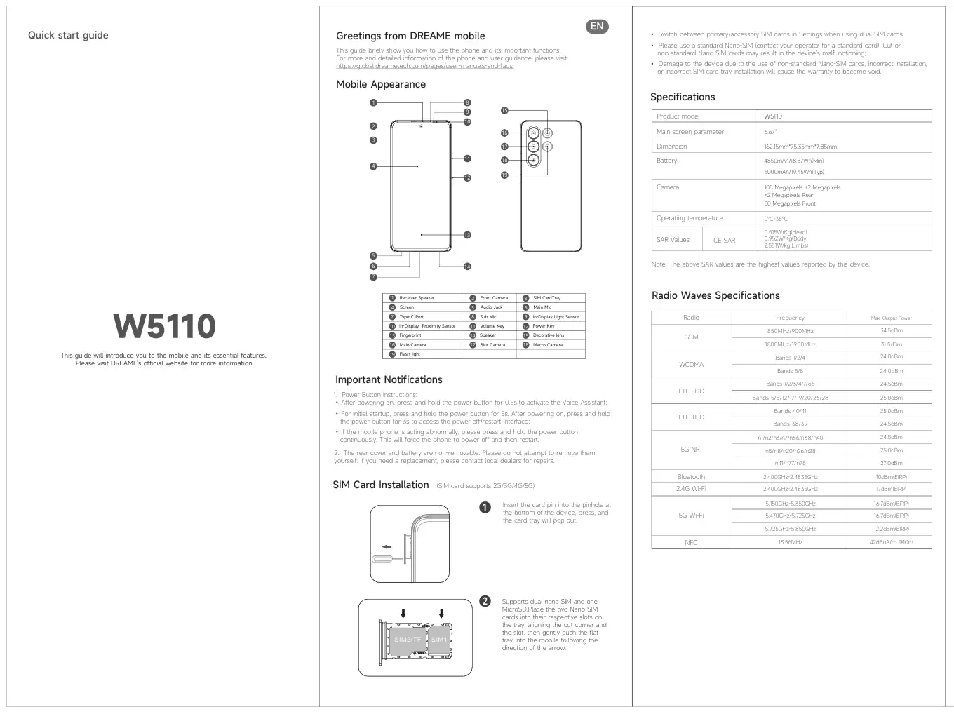 根据最新认证信息及用户手册,该手机的商业名称定为“Dreame Smartphone E1”,型号W5110,配备6.67英寸AMOLED屏幕,支持屏下指纹识别技术。影像系统方面,搭载5000万像素前置摄像头,后置三摄模组包含1.08亿像素主摄、200万像素景深镜头及200万像素微距镜头。