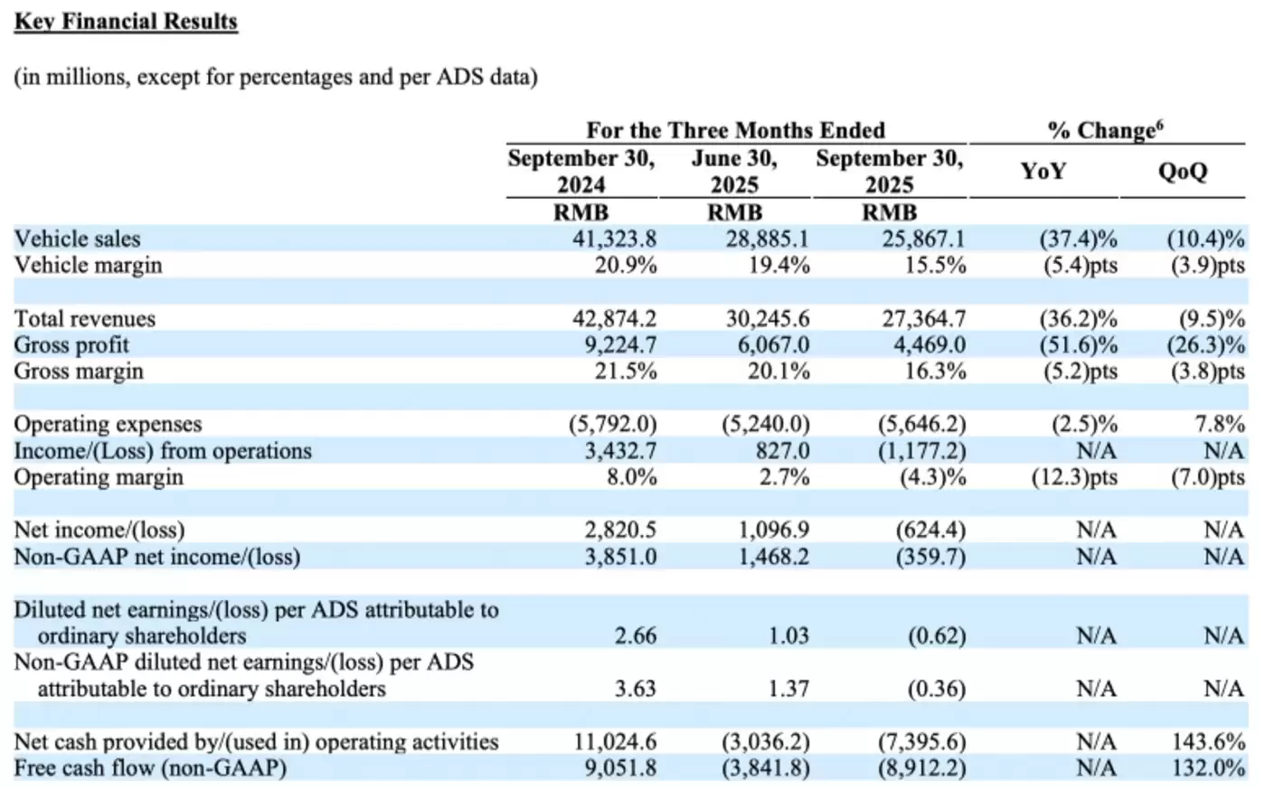 根据其在 11 月下旬发布的最新财报,理想汽车在 2025 年 Q3 的营收为 274 亿元,去年同期为428.7 亿元;毛利为 45 亿元,去年同期为 92 亿元,同比下滑 51.6%——毛利率为 16.3%,而去年同期为 21.5%。