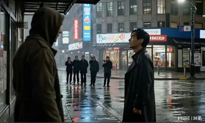 提示词:一个男人站在雨中的街头,他穿着黑色风衣,雨水顺着他的脸往下流。他慢慢抬起头看向天空,然后低声用上海话说:“是时候做个了断了。”镜头切换到对面的人,对面的人回答:“你要怎么做?”,背景是模糊的霓虹灯和湿漉漉的街道,最后镜头切换到男人背后的几个路人,几个路人在马路对面,静静地观察。