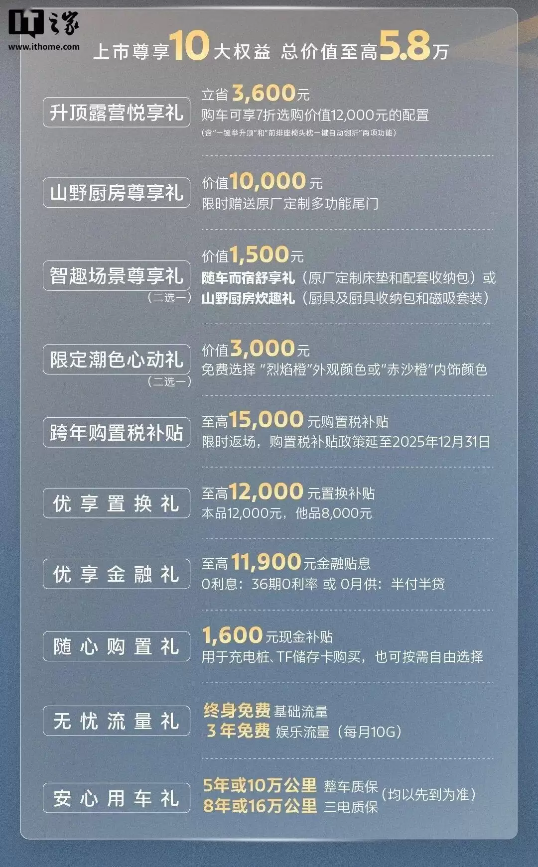 为了回馈广大消费者,福特智慧烈马还推出了10大上市权益,包括限时赠送原厂定制多功能尾门、限定内饰、至高1.5万元购置税补贴、至高1.2万元置换补贴、1600元现金补贴、5年或10万公里整车质保、8年或16万公里三电质保等,让用户在购车过程中享受到更多的实惠和保障。