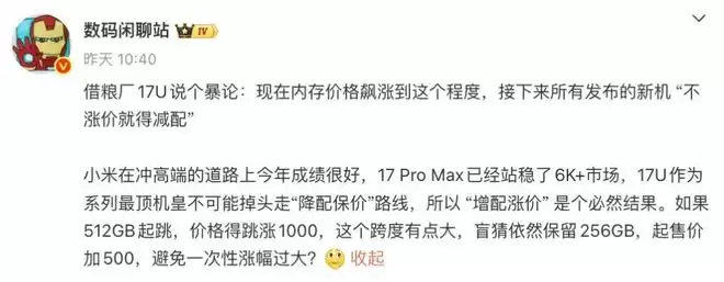 小米在冲高端的道路上今年成绩很好,17 Pro Max已经站稳了6K+市场,17U作为系列最顶机皇不可能掉头走“降配保价”路线,所以 “增配涨价” 是个必然结果。