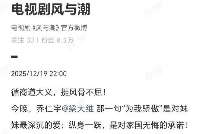 12月17日,也就是《风与潮》港币汇率大战收官时,对于乔仁宇被妹妹的误会,梁大维发博说:误会只是暂时的,只要能拿下胜利,一切都值得!