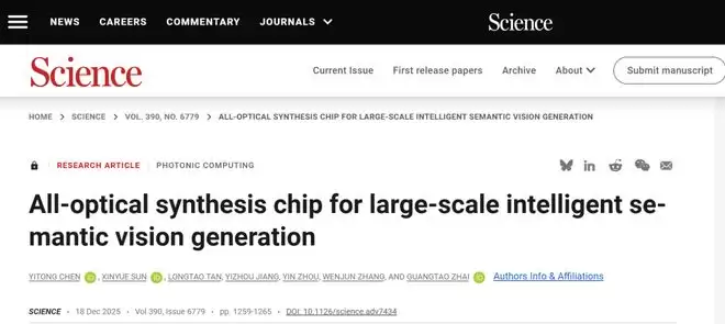 据微信公众号“科创闵行”报道,北京时间12月19日,上海交通大学集成电路学院(信息与电子工程学院)图像通信与网络工程研究所的陈一耘课题组,在新一代算力芯片领域实现重大突破,成功研发出了首款支持大规模语义媒体生成模型的全光计算芯片。相关研究成果以“All-optical synthesis chip for large-scale intelligent semantic vision generation”(大规模智能语义视觉生成全光芯片)为题,发表在国际顶级学术期刊《科学》(Science)上。上海交通大学为论文的第一作者和通讯作者单位,陈一耘助理教授担纲第一作者及通讯作者。