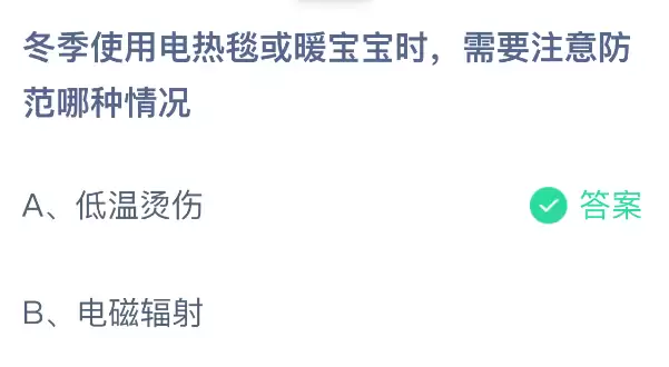 冬季使用电热毯或暖宝宝时,需要重点防范哪种安全隐患?支付宝小鸡课堂开课啦!每天花一分钟参与答题,就能赢取饲料喂养小鸡,奉献爱心就是这么简单轻松,还能收获十足的成就感!2025年12月20日蚂蚁庄园的课堂题目正确答案是【低温烫伤】。没错,冬季使用电热毯或暖宝宝时,一定要注意防范低温烫伤。