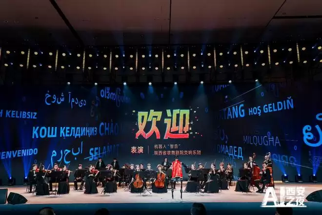 舞台上,由中央音乐学院人工智能作曲系统创作的《欢迎》交响乐,在机器人“智音”的指挥和陕西省歌舞剧院交响乐团的演奏下,拉开了“AI西安之夜”的帷幕。人民网主持人许博和人民网数字人“白泽”登场,将观众带入虚实共生的梦幻现场。