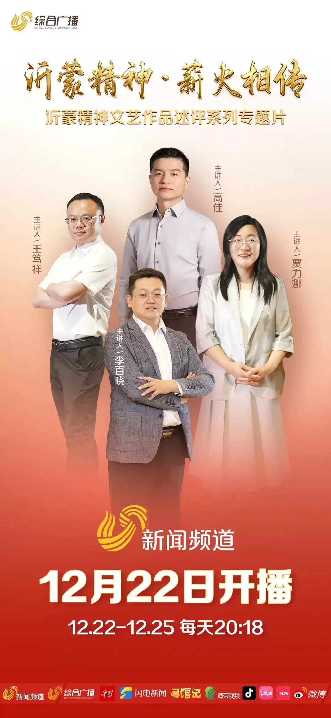 《沂蒙精神文艺作品述评系列专题片》将于2025年12月22日起,在山东广播电视台新闻频道开启连续5天的重磅播出。