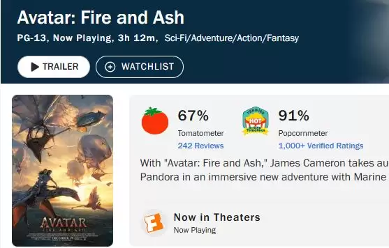 在《阿凡达:火与烬》开放评论之后,评价也是褒贬不一。烂番茄只有67%的新鲜度,是迄今这三部的最低分。