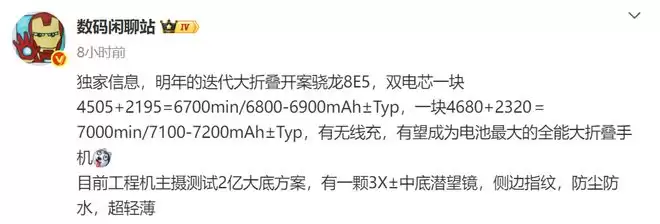 爆料还提到支持无线充电,考虑到大容量电池和无线充电功能往往需要更多的内部空间,这一组合对结构设计提出了更高要求。