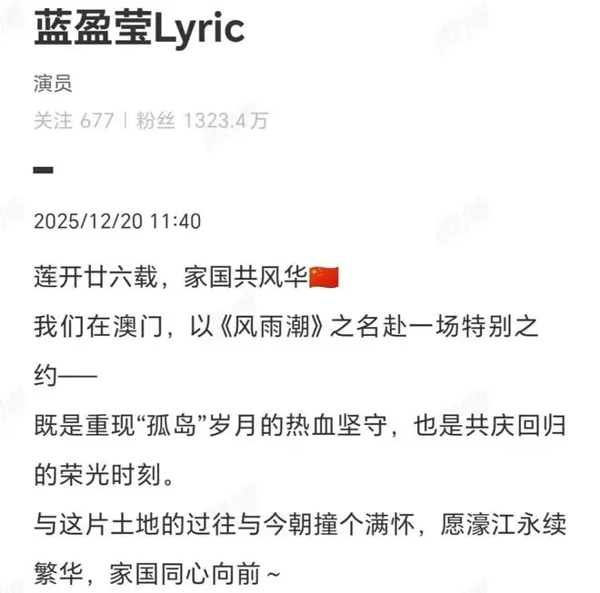 12月19日,《风与潮》澳门观影交流会在澳门成功举行。在交流会成功举行和澳门回归26周年之际,《风与潮》女主乔音婉演员蓝盈莹写道:莲开廿六载,家国共风华。
